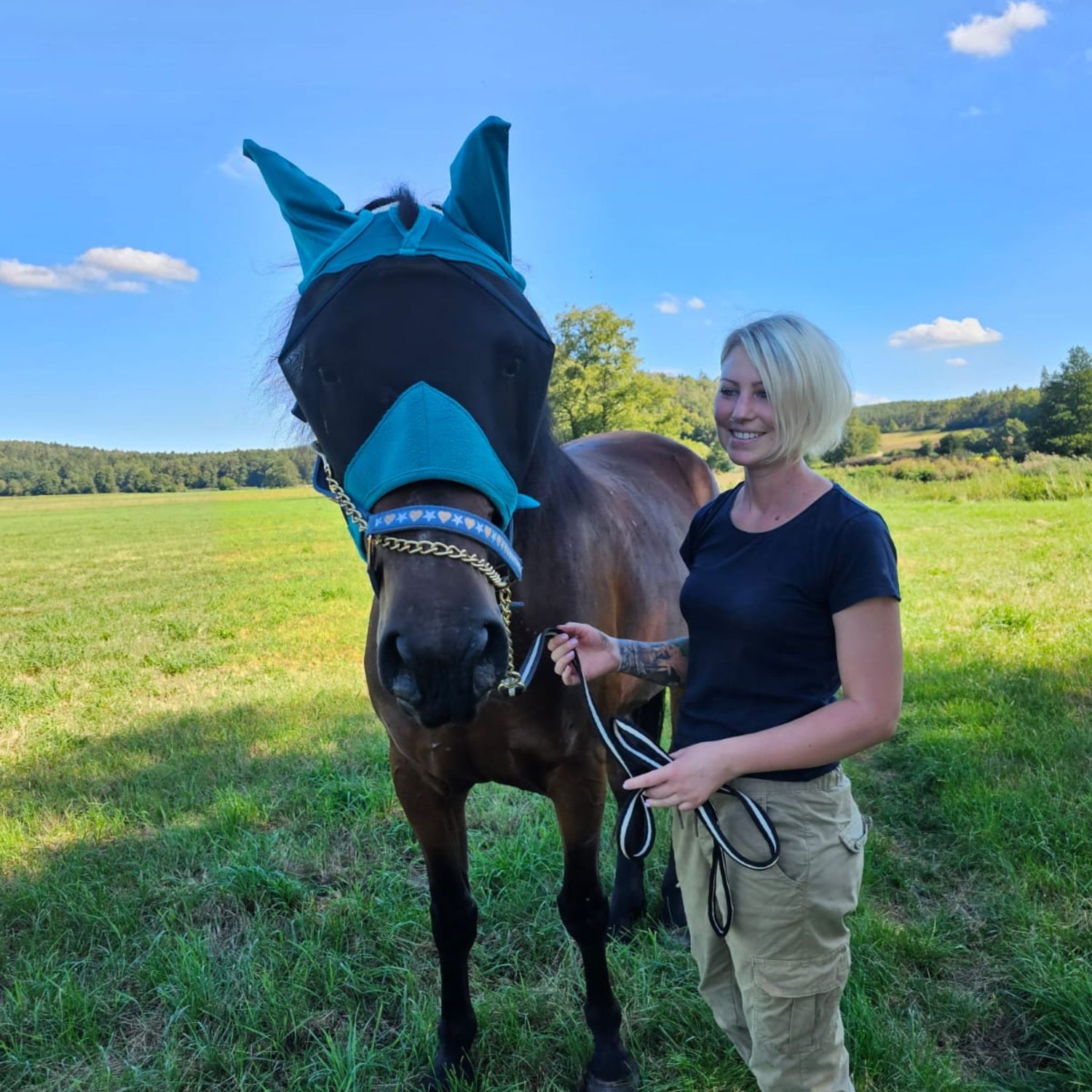 Gerade im Frühjahr und Sommer, wenn Fliegen, Bremsen und Co. wieder aktiv sind und Deinem Liebling gehörig auf die Nerven gehen, gehört es für uns einfach dazu, dass wir jedem Pferd vor der Koppel seine Fliegenhaube anbringen und danach auch wieder entfernen.